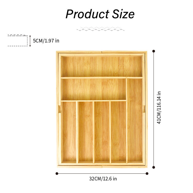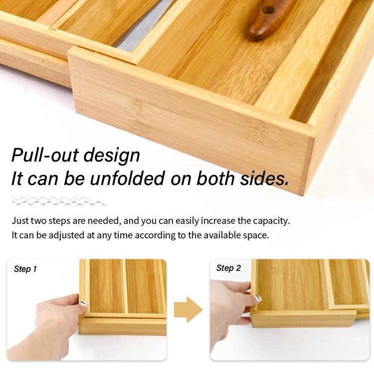 Presentamos los Organizadores de Cajones de Bambú en Oferta Caliente WDF, esenciales para cada hogar organizado. Estos organizadores están hechos de bambú de alta calidad que es ecológico pero resistente. Diseñados específicamente para cajones de cocina, resuelven el problema del desorden de cubiertos y vajilla. Este organizador de cajón de utensilios cuenta con divisores ajustables que facilitan la personalización de tu diseño para adaptarse a tu cajón más ancho o más pequeño. Cuando se trata de estos organizadores, despidete mágicamente de ese frustrante desorden de cajón.
